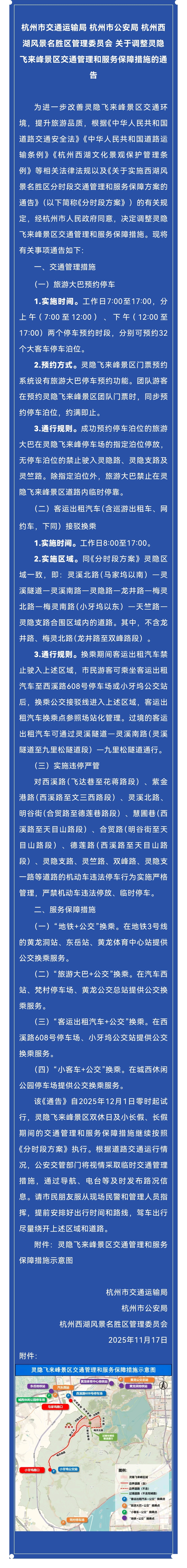 11月19日,杭州市交通运输局、杭州市公安局、杭州西湖风景名胜区管理委员会三部门发布《关于调整灵隐飞来峰景区交通管理和服务保障措施的通告》,通告全文如下: