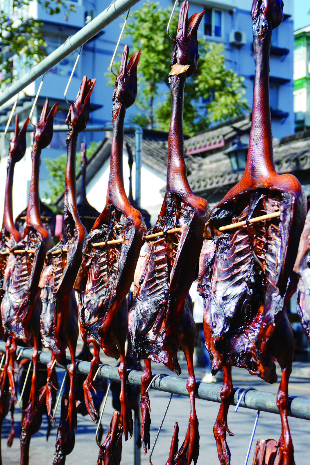 入冬后,气温骤降。杭州街头,一排排整齐晾挂的酱鸭形成一道独特的风景线。昨天上午,天气晴好,杭州察院前巷的一家家酱鸭店门口,数十只酱鸭一字排开,油光锃亮,酱香萦绕,俨然一幅生动的市井画卷。在文娟酱鸭店,“现在每天可以卖60只酱鸭,还有客户已提前预订了80只。”老板韩玲告诉记者。