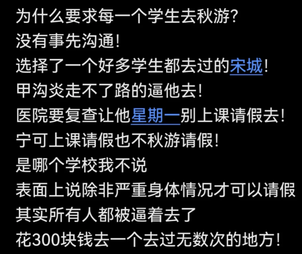 社交平台上,一位IP地址为浙江家长发帖称,学校要求每个学生去秋游,但自家孩子想请假,一是因为甲沟炎走不了路要去医院复查,二是秋游目的地是去过很多次的地方。