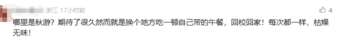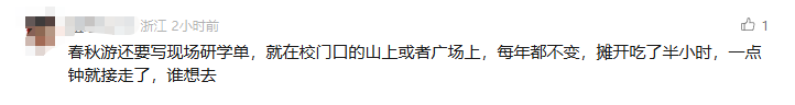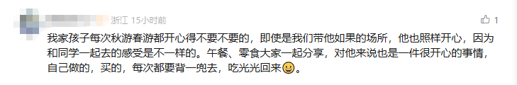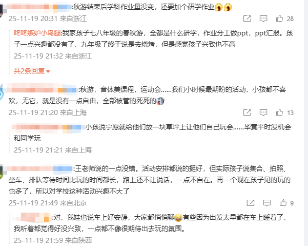 “我家孩子七八年级的春秋游,全都是什么研学,作业分工做ppt,ppt汇报。孩子一点兴趣都没有了,九年级了终于说是去烧烤,但是感觉孩子兴致也不高。”