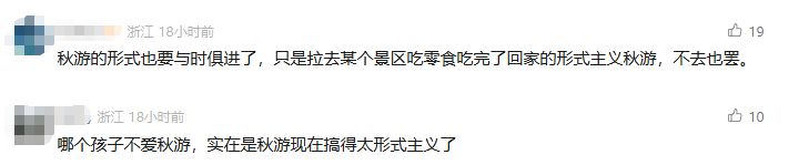 大家都认为,秋游的形式也有与时俱进,如果只是一起去某个去过很多次的地方进去吃完零食就回家的“形式主义秋游”,那不去也罢!