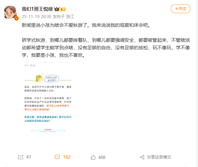 在社交平台上,拥有百万粉丝的教育类博主“我们1班王悦微”聊了聊自己的体会,她说:“研学式秋游,到哪儿都要排着队,到哪儿都要强调安全,都要被管起来,不管啥活动都希望学生能学到点啥,没有足够的自由,没有足够的放松,玩不像玩,学不像学,我要是小孩,我也不喜欢。 ”