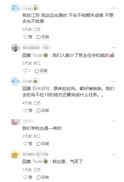 提出请假诉求,意外遭到学校的拒绝,家长表示不理解,甚至有些愤怒。帖子下有一些留言,来自浙江、江苏的一些家长表示,自家学校也一样,甚至“不去不给期末成绩,不想去也不批假。”