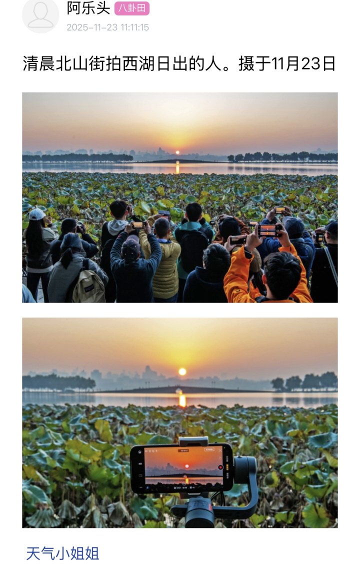 都市快报讯 难得周末遇上大晴天,大家今天都去哪里“孵太阳”了?有网友一早去了西湖边“蹲”太阳,也有网友选择去爬宝石山……