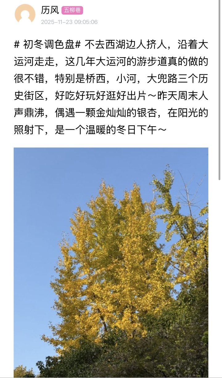 还有网友“历风”,选择避开西湖去运河散步,“这几年大运河的游步道真的做得很不错,特别是桥西、小河、大兜路三个历史街区,好吃好玩好逛好出片。昨天周末人声鼎沸,偶遇一棵金灿灿的银杏,在阳光的照射下,是一个温暖的冬日下午。”