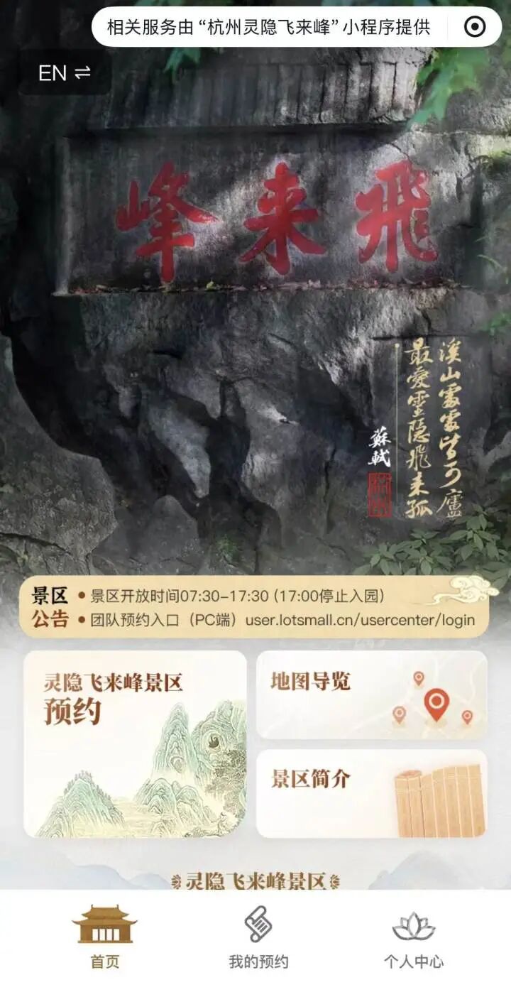 便于大家提前熟悉预约功能,“杭州灵隐飞来峰”官方小程序已经在支付宝和微信同步上线,并将于明天(11月24日)上午8:00正式开放预约功能。