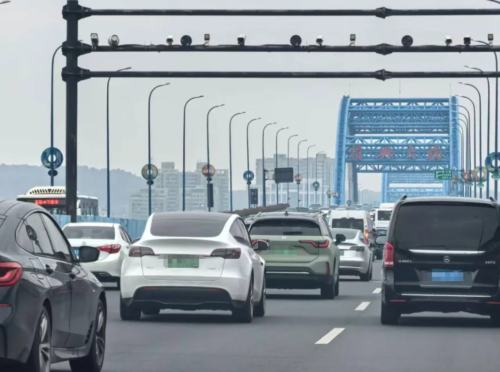 从匝道上桥汇入主路后,前方车流明显多起来了。