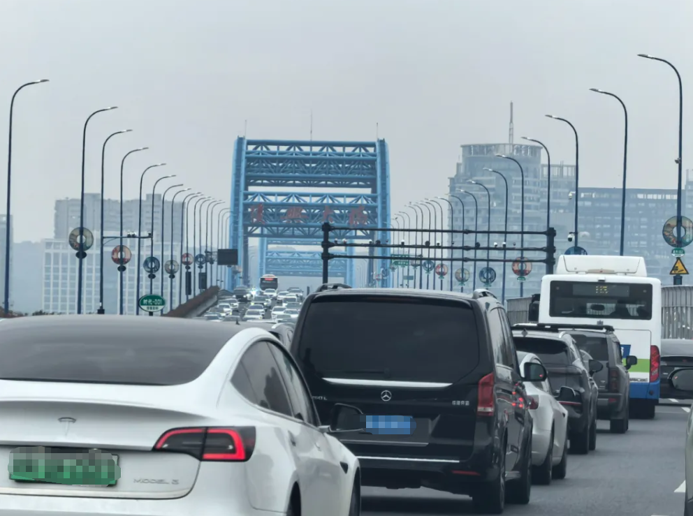虽然车流量大,但整体通行还算有序,汽车沿着前车往前挪准备进入主线,车速保持在25-30km/h。到了江面位置,通行情况稍有缓解,邓师傅轻踩油门将车速提升至40km/h,“哪怕三桥不封闭,平常这里也是堵的。周一本来就是最忙的。”