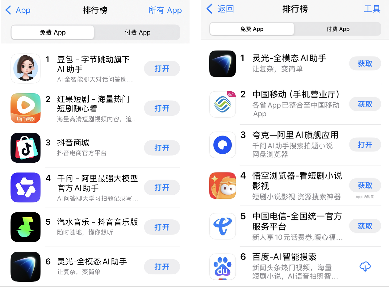至11月24日,App Store中国区免费榜前15位有多款AI产品上榜,豆包居于第一,新推出的“千问”“灵光”分别居于第四、第六位,腾讯元宝和夸克位于第八、第十三位。