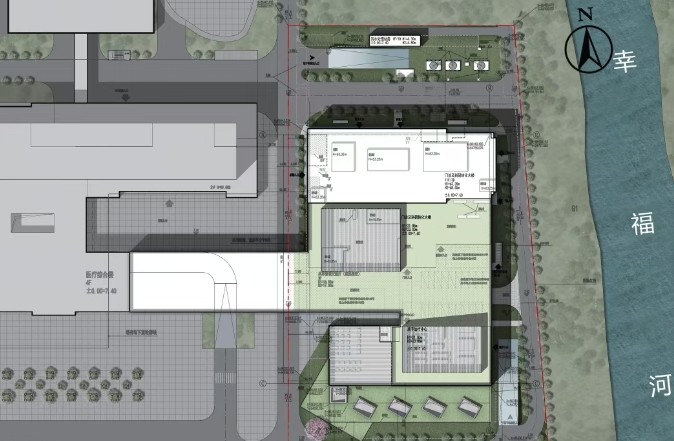 此次公示的为批复的总平面图主要立、剖面图及总体鸟瞰图,其中可以看到扩建项目主要涵盖医院门诊、质子中心及放疗中心以及车库等相关配套用房。
