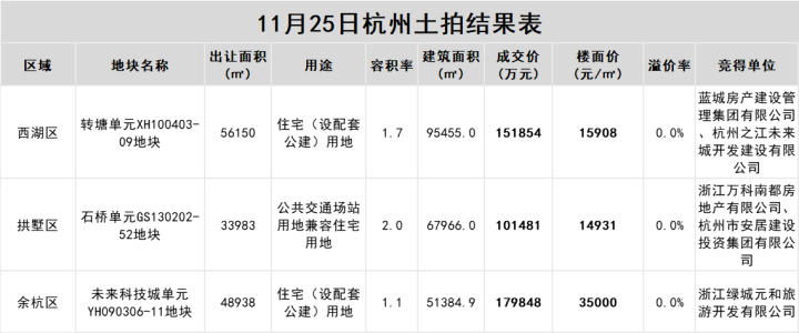 其中两宗是品牌房企联合杭州国企竞得。出乎意料的是,此前被寄予厚望的未来科技城1.1容积率住宅同样没有溢价,以3.5万元/平方米的楼面价成交,由绿城竞得。此外,万科时隔一年多,再次出现在了杭州土地市场。