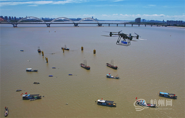 Drones deliver a fresh catch from the Qiantang River minutes after the fishing ban ends on July 1. [Photo/hangzhou.com.cn]