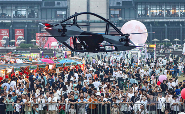Flying vehicles and multicopters fill the skies above HangzhouGrand Canal Steelworks Park on Oct 7, giving citizens a glimpse into the future of low-altitude travel. [Photo/hangzhou.com.cn]