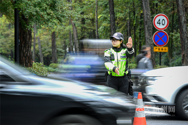 A traffic police officer equipped with AI smart glasses manages flows near Lingyin and Longjing roads on Nov 9, enhancing real-time traffic control. [Photo/hangzhou.com.cn]