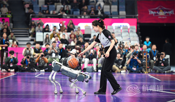 At the WCBA All-Star Game on Feb 23, robot dogs serve players and fans alike — delivering balls and gifts, sparking laughter courtside. [Photo/hangzhou.com.cn]