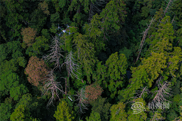 In Lin'an district's Tianmu Mountain, drones navigate dense forests on Sept 8 as they deliver care materials to ancient trees, greatly improving maintenance efficiency. [Photo/hangzhou.com.cn]