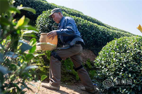 Hip-assist exoskeleton robots help farmers climb slopes and pick West Lake Longjing tea with ease on March 20. [Photo/hangzhou.com.cn]