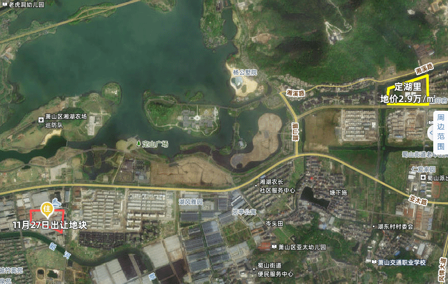 今天成交的湘湖宅地位于亚太路以南,属于杨岐山片区。地块背靠湘湖三期,步行两三百米就能走到湘湖边,最近的景点有湘湖院士岛、定山广场等。