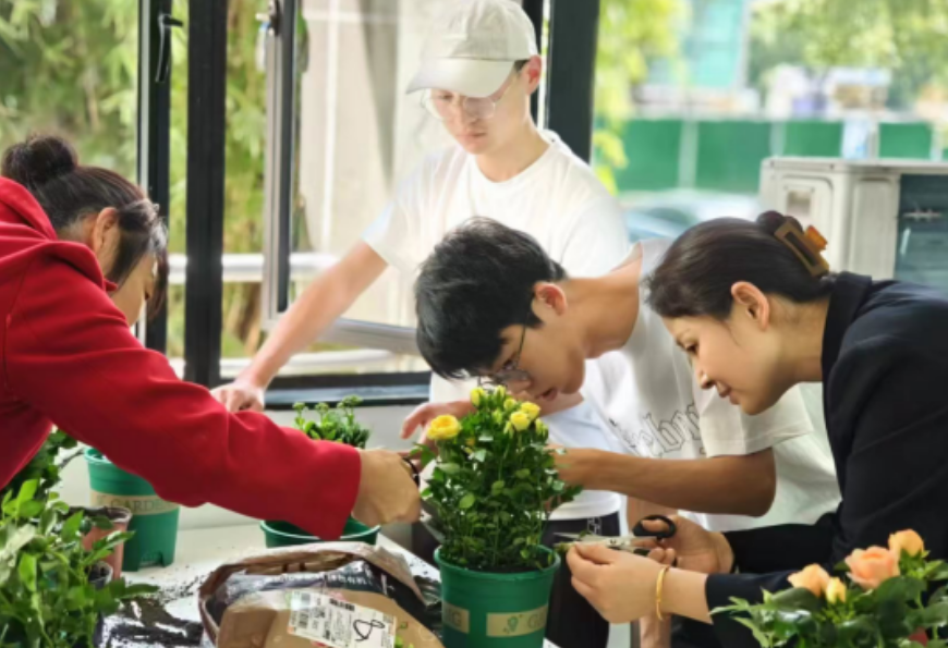 据悉,这是浙商大后勤公寓每月举办的“阿姨课堂”手作活动。在这里,宿管阿姨们摇身一变,成了学生们的“手工导师”,手把手传授香囊花束、丝带玫瑰、针织坐垫、纸藤灯笼等趣味手工的制作技巧。除了手工编织课,阿姨们还开设了绿植养护课堂。