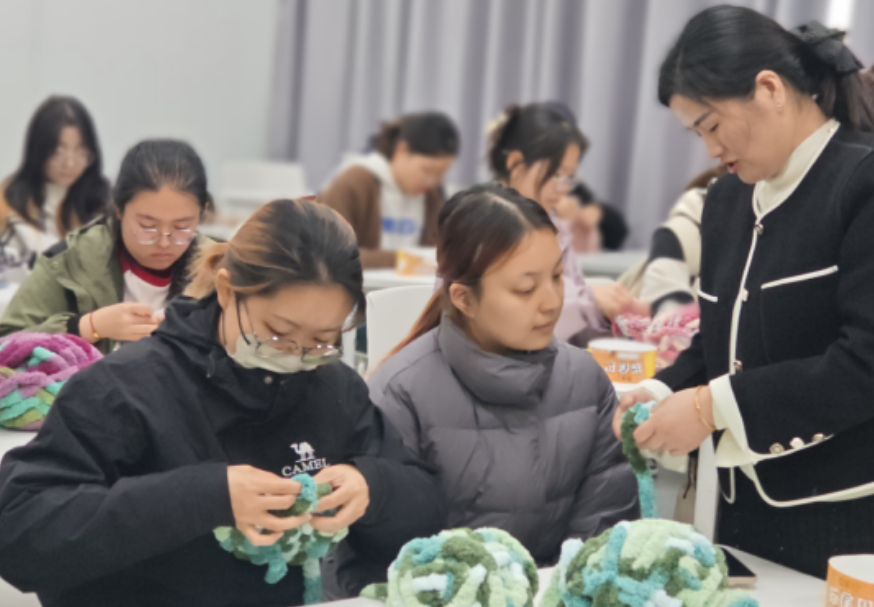 活动现场,该校公管学院大三年级的韩惠旭同学兴奋地展示着她的半成品:“我要编一个坐垫送给妈妈,她每天上班坐久了腰会疼。虽然做得不够完美,但每一针都包含着我的心意!”