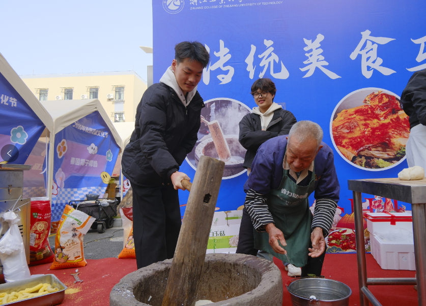 “嘭!嘭!嘭!”木槌撞击石臼的闷响,在浙江工业大学之江学院的初冬校园里回荡。诸暨籍大三学生方昊攥着木槌的手臂不停起落,熟悉的年糕香扑面而来——这个刻在记忆里的家乡味,让他在校园美食节的非遗体验区,与老手艺撞了个满怀。