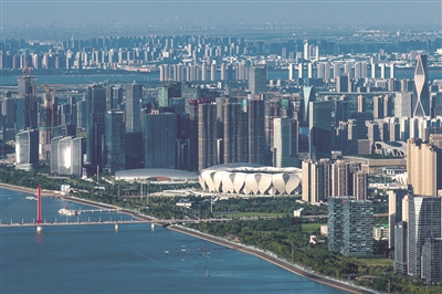 钱江新城“前低后高”的布局中,“日月同辉”、高德置地广场与“杭州之门”错落排布,勾勒出富有韵律的现代曲线。钱江南岸奥体板块,“大莲花”的轻盈轮廓与“杭州之门”的挺拔形态相映成趣。