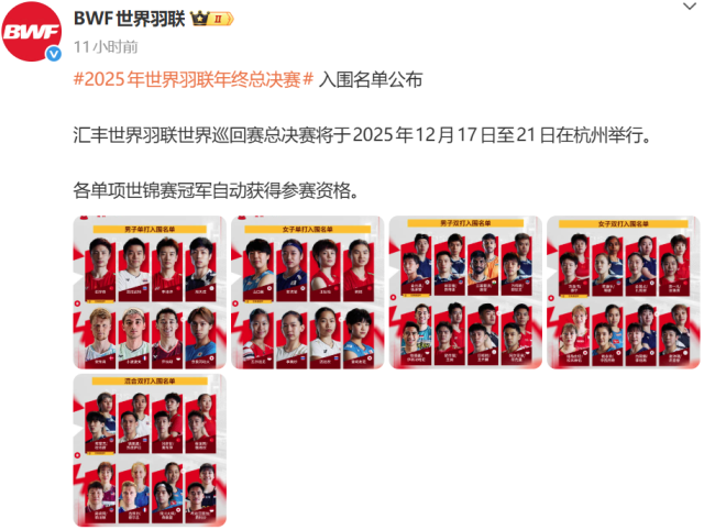 日前,BWF世界羽联发布消息,2025年世界羽联年终总决赛将于2025年12月17日至21日在杭州举行。
