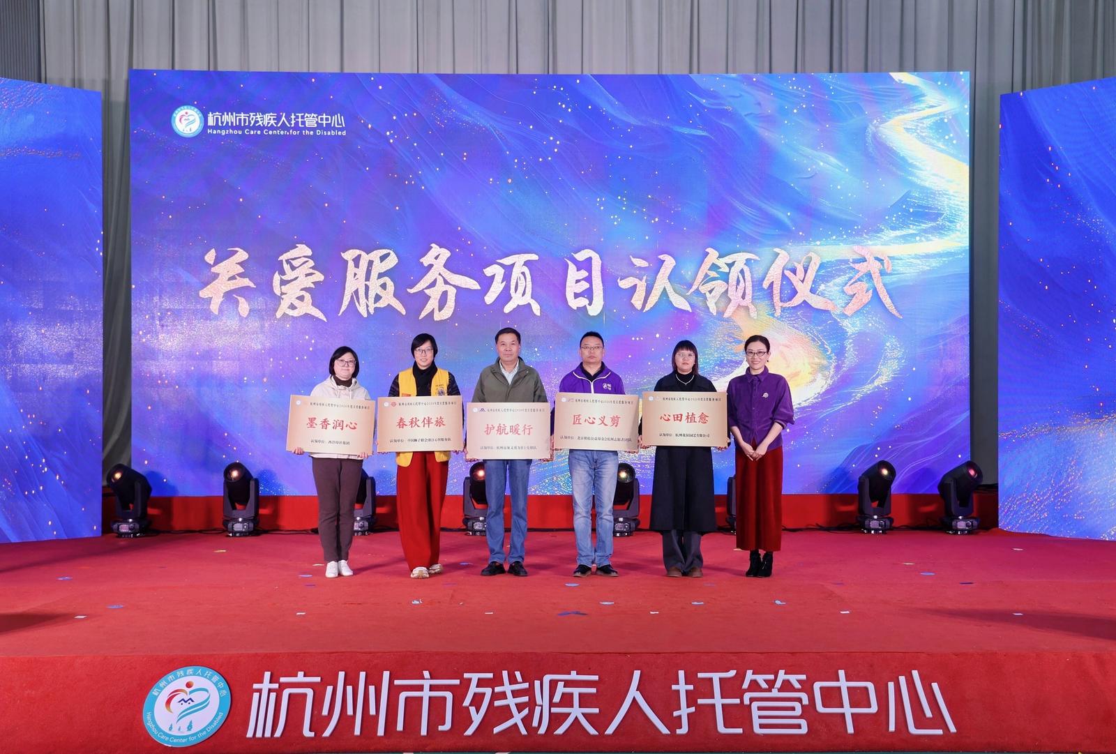 活动现场暖意融融,爱心企业与社会组织纷纷伸出援手。民建拱墅区四支部、杭州招林蔬菜有限公司、金瀚创业者艺术团带来爱心物资捐赠,用实际行动为残疾人朋友送上关怀与温暖;为精准对接养护员需求,中心创新推出“墨香润心”“春秋伴旅”“护航暖行”等五大关爱项目,西泠印社集团、中国狮子联会浙江心智服务队、杭州市见义勇为勇士先锋队等单位积极响应、主动认领,现场工作人员为各爱心团队颁发认领证书,见证这份沉甸甸的爱心承诺。