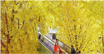 近日,杭州大厦C座天桥扶梯两侧的6棵银杏树已在寒风中渐次泛黄,灿烂如金。乘扶梯上下天桥的人们穿行其中,宛若进入了黄灿灿的童话世界。