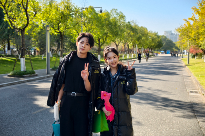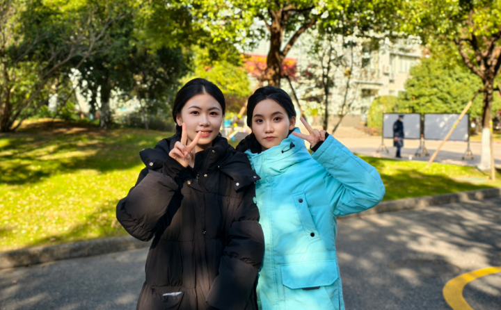 和王同学同一个艺术培训机构的学姐,今天特地来校园里为她加油打气。学姐在浙传双语播音专业读大二,作为过来人,给王同学分享了很多备考经验。