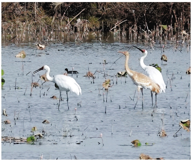 The white crane (Grus leucogeranus) is the national first-class protected animal, with the global quantity of less than 4,000, belonging to the critically endangered species; 98 percent of white cranes overwinter at Poyang Lake. The eastern population is currently the only existing migratory population. After many years of wetland conservation, the South Lake in Yuhang has become the important stopover site for this population during migration.