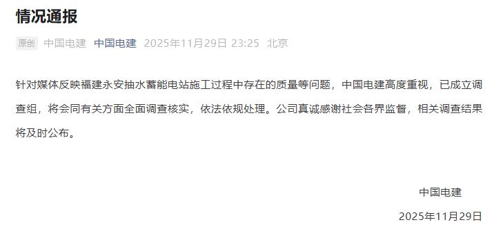 央视网消息:据中国电建微信公众号消息,中国电建11月29日晚发布情况通报,针对媒体反映福建永安抽水蓄能电站施工过程中存在的质量等问题,中国电建高度重视,已成立调查组,将会同有关方面全面调查核实,依法依规处理。公司真诚感谢社会各界监督,相关调查结果将及时公布。