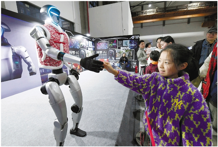 图为今年3月在杭州武林之星博览中心举办的2025环梦AI智能机器人科普展上,小观众与舞台上的宇树科技机器人握手。记者 李忠 摄(本报资料照片)