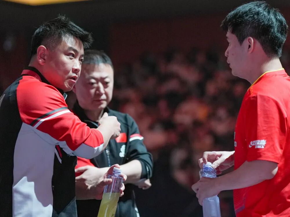 △ 11月30日,中国队教练王皓(左)在男单比赛中指导林诗栋。新华社记者 王曦 摄