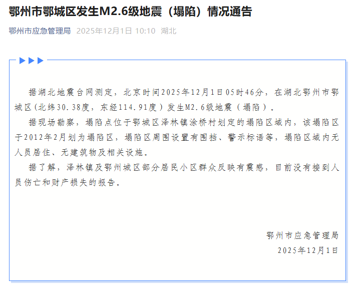 央视网消息:鄂州市应急管理局12月1日通报,据湖北地震台网测定,北京时间2025年12月1日05时46分,在湖北鄂州市鄂城区(北纬30.38度,东经114.91度)发生M2.6级地震(塌陷)。