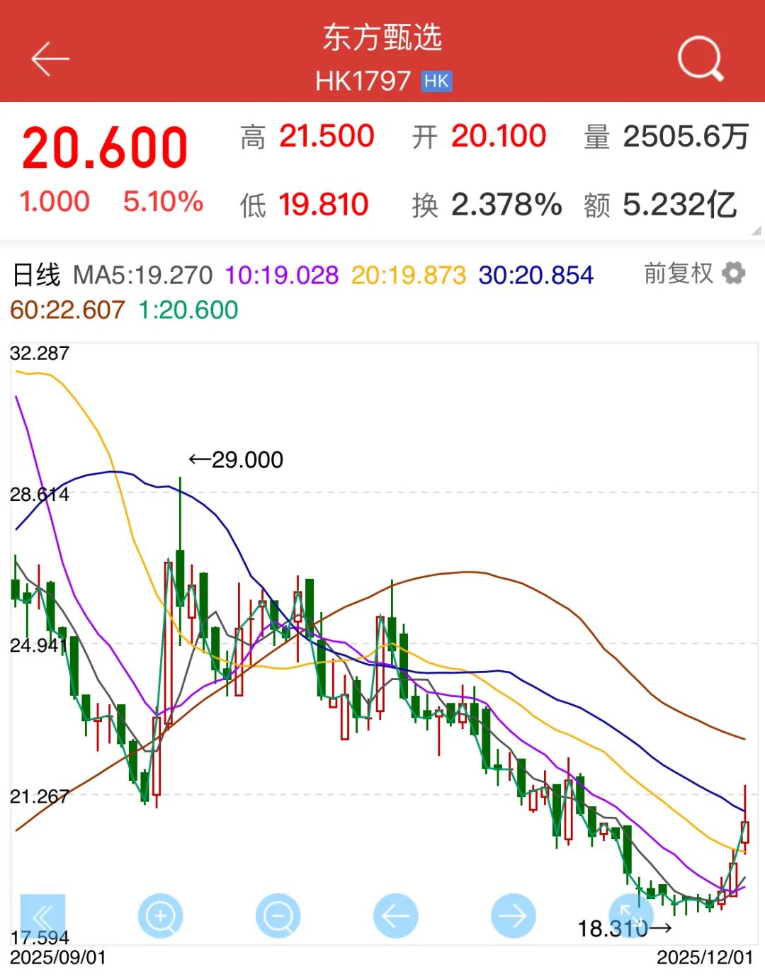 每日商报讯 12月1日,港股东方甄选迎来近日的罕见大涨,盘中大涨近10%。截至收盘,涨5.1%,收报20.6港元/股,最新市值超217亿港元。