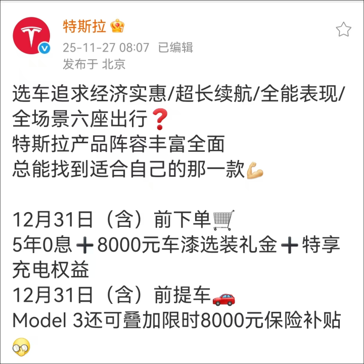 除了车购税兜底,也有车企推出12月购车权益。特斯拉就是典型代表。11月27日,特斯拉中国公布了 12 月购车权益,覆盖 Model 3 、 Model Y 、Model Y L等全系车型。消费者在 2025 年 12 月 31 日(含)前下单,可享受 5 年 0 息的金融方案、8000 元车漆选装礼金和特享充电权益,在12月31日(含)前提走 Model 3,还可叠加享受8000元保险补贴。