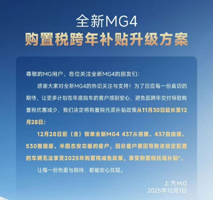 12月1日,MG为全新MG4推出购置税托底补贴延长政策,称为避免因跨年交付导致购置税优惠减少,MG决定将购置税托底补贴政策从11月30日延长至12月28日。