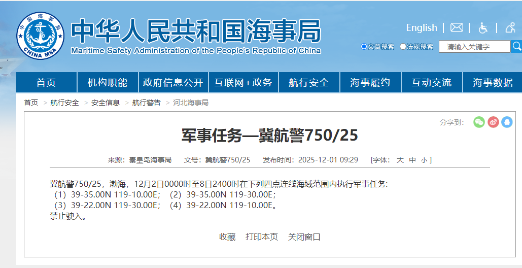 央视网消息:据中国海事局网站消息,秦皇岛海事局发布航行警告,12月2日0时至4日24时、12月2日0时至8日24时,渤海部分海域执行军事任务,禁止驶入。