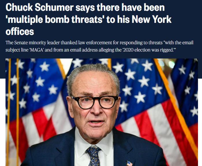 据报道,舒默在一份声明中表示,纽约执法部门通知称,他在纽约罗切斯特、宾厄姆顿和长岛的办公室收到了炸弹威胁邮件,邮件主题为“MAGA”(让美国再次伟大)。