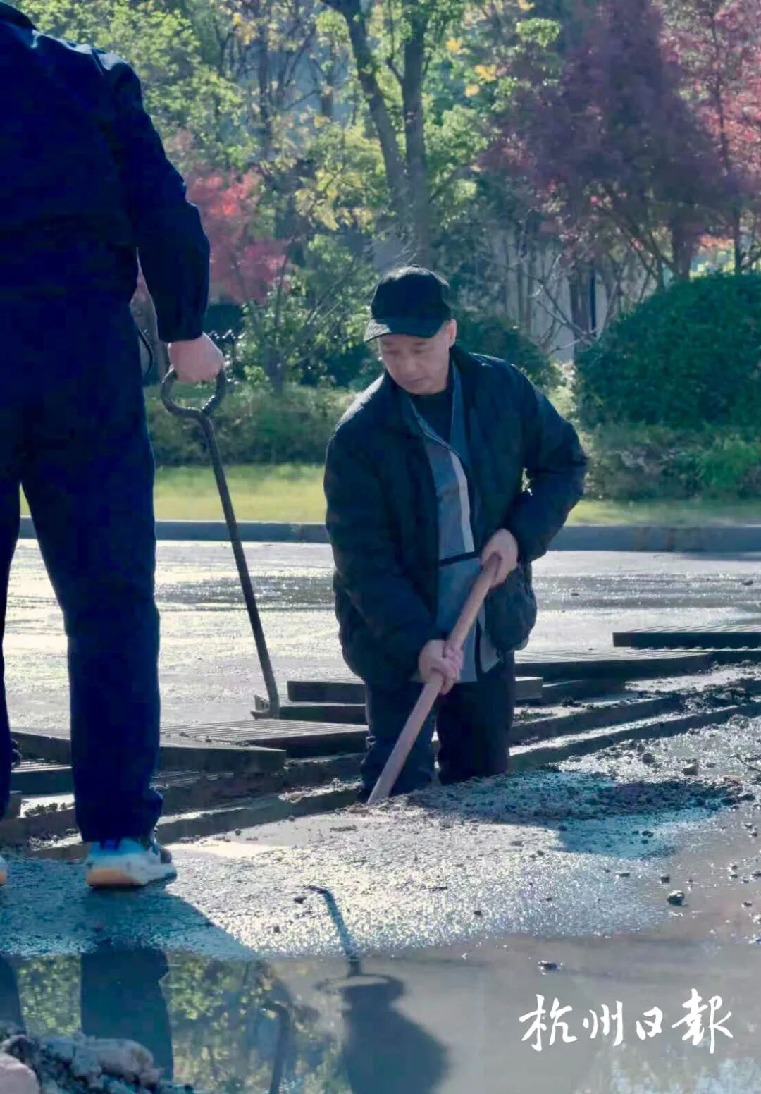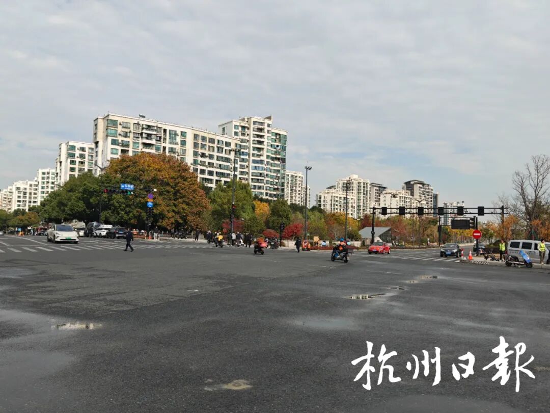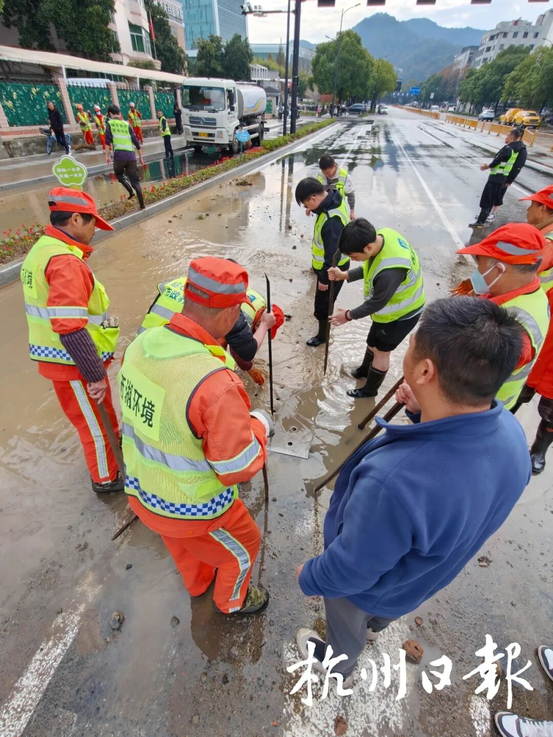 11时30分,古墩路南向北位置,工作人员进行路面清理收尾工作,古墩路一侧的积水已基本清理完毕。