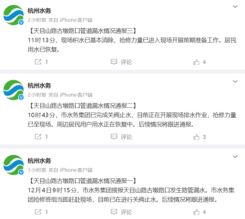 据杭州水务,目前现场积水已基本消除,抢修力量已进入现场开展前期准备工作。居民用水已恢复。