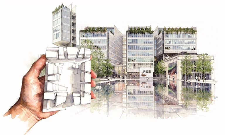 天目里的核心竞争力在于其“艺术+商业”的生态营造。园区不仅是一个商业综合体,更是一个多元社区和没有围墙的美术馆。建筑围合出来的中庭广场,是由设计波尔图交易所广场水景的JML事务所打造的水镜广场。白天,2厘米的薄薄水层如镜面般反射天空;夜间则有灯光和喷泉,成为杭州知名的打卡点。园区打造了以“风”“水”“空”为主题的庭院,美国植物生态学家Paul Kephart则规划了100多种植物构成的立体植物王国。这种对设计的极致追求,创造了与众不同的空间体验。