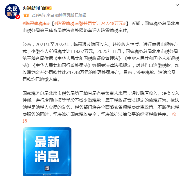 经查,2021年至2023年,陈震通过隐匿收入、转换收入性质、进行虚假申报等方式,少缴个人所得税共计118.67万元。2025年11月,国家税务总局北京市税务局第三稽查局依据《中华人民共和国税收征收管理法》《中华人民共和国个人所得税法》《中华人民共和国行政处罚法》等相关法律法规规定,对其作出追缴税款、加收滞纳金并处罚款共计247.48万元的处理处罚决定。目前,涉案税款、滞纳金及罚款均已追缴入库。