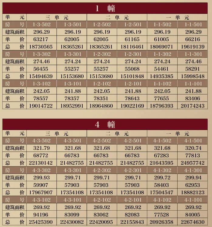 起步总价880万元,有3套在1000万元以下,最高总价1489万元。