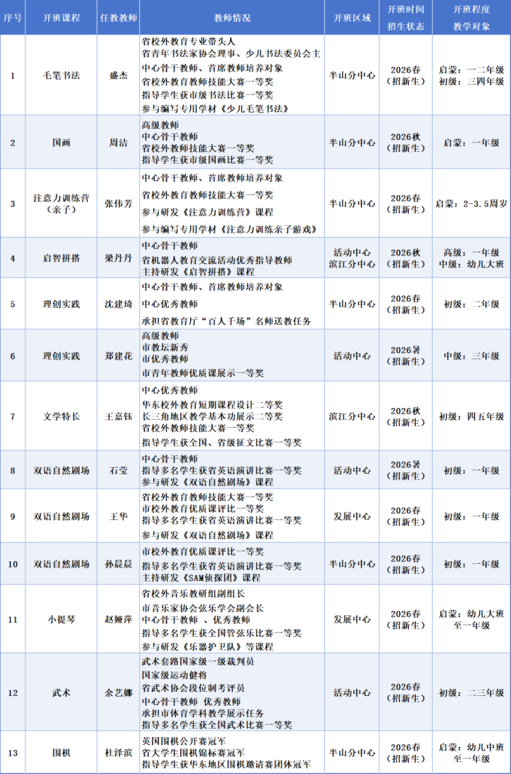 2026年,杭州青少年活动中心又推出10门优质课程的精品班,分别由13位优秀教师任课。