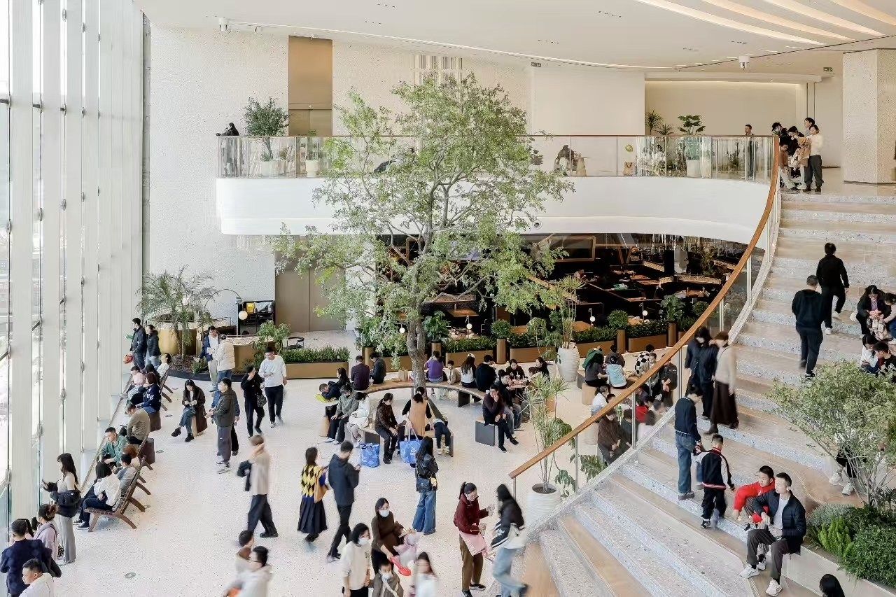 上城天街紧邻中国直播电商及四季青产业区,边上就是丰收湖公园。这一次逛天街,感受比较大的不同是,它不再是一个盒子样式的封闭空间,它在一层首创“茶话巷”,以半开放式市集空间呈现,让人不经意间就进入到商场空间,非常有亲和力。