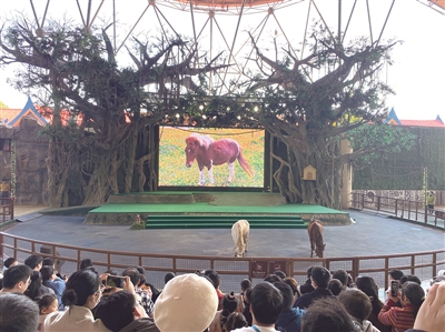 中午12点半,欢乐剧场展示正式开始。昨天展示的小动物也很多,比如丹顶鹤、山羊、小矮马、猴子、鹦鹉、小香猪等。
