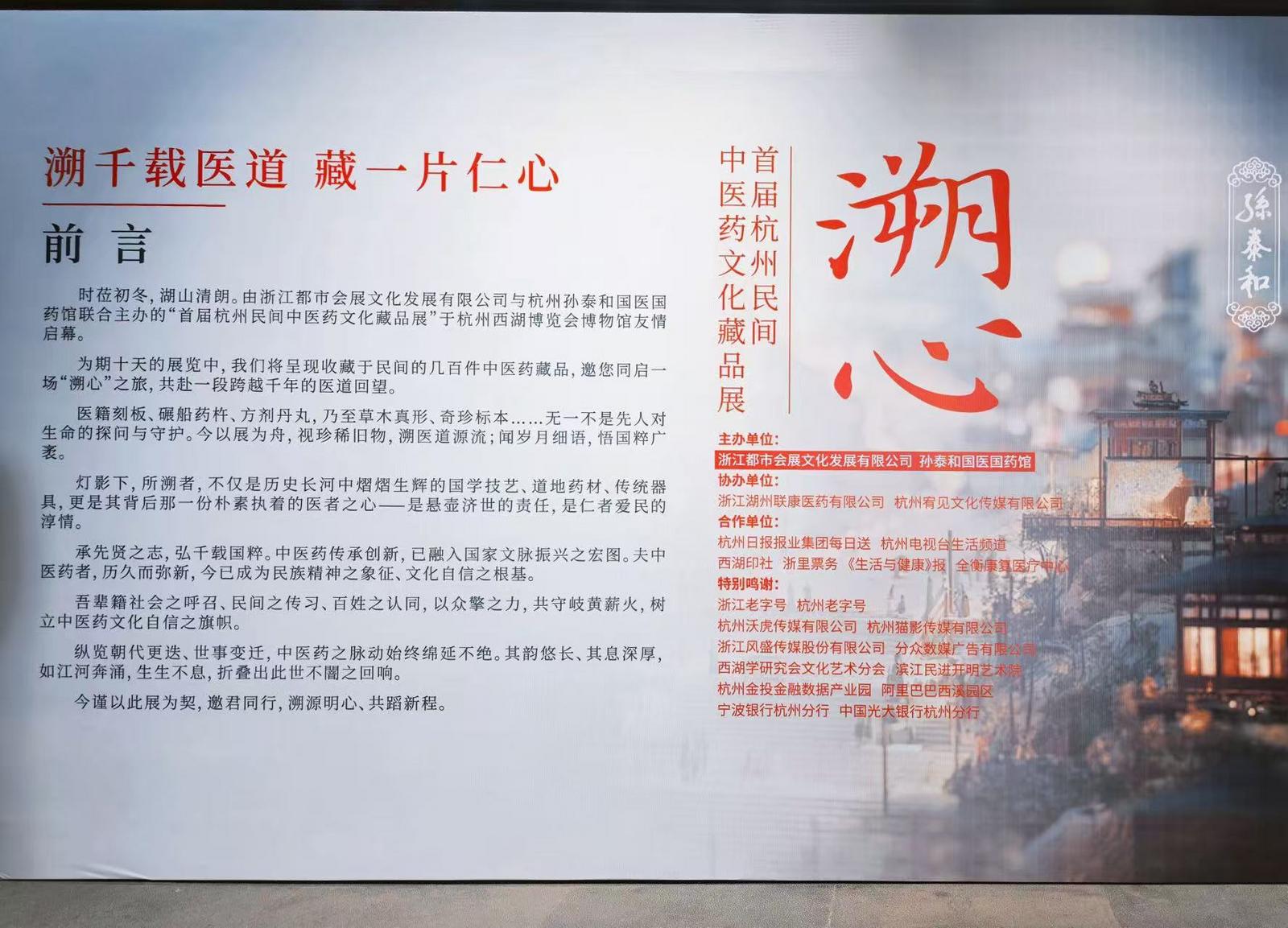 时莅初冬,湖山清朗。12月8日上午,由孙泰和国医国药馆、浙江都市会展文化发展有限公司联合主办的“首届杭州民间中医药文化藏品展”于杭州西湖博览会博物馆启幕。本次活动亦为孙泰和国医国药馆复设12周年主题文化活动之一,以“溯心”为主题,溯千载医道,藏一片仁心,旨在弘扬中医药文化,共赴一段跨越千年的医道回望。