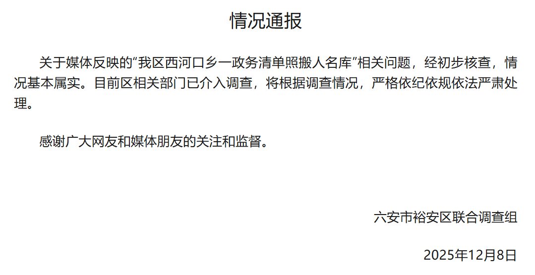 央视网消息:据“裕安区人民政府发布”微信公众号消息,安徽六安市裕安区联合调查组12月8日发布情况通报:关于媒体反映的“我区西河口乡一政务清单照搬人名库”相关问题,经初步核查,情况基本属实。目前区相关部门已介入调查,将根据调查情况,严格依纪依规依法严肃处理。